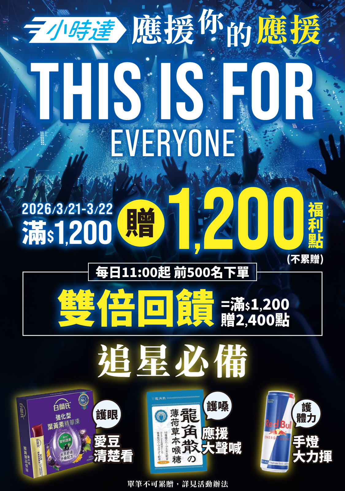 (案型1.)活動期間購買小時達單筆滿1200元贈1200福利點。單筆不可累贈,每會員上限1200福利點。