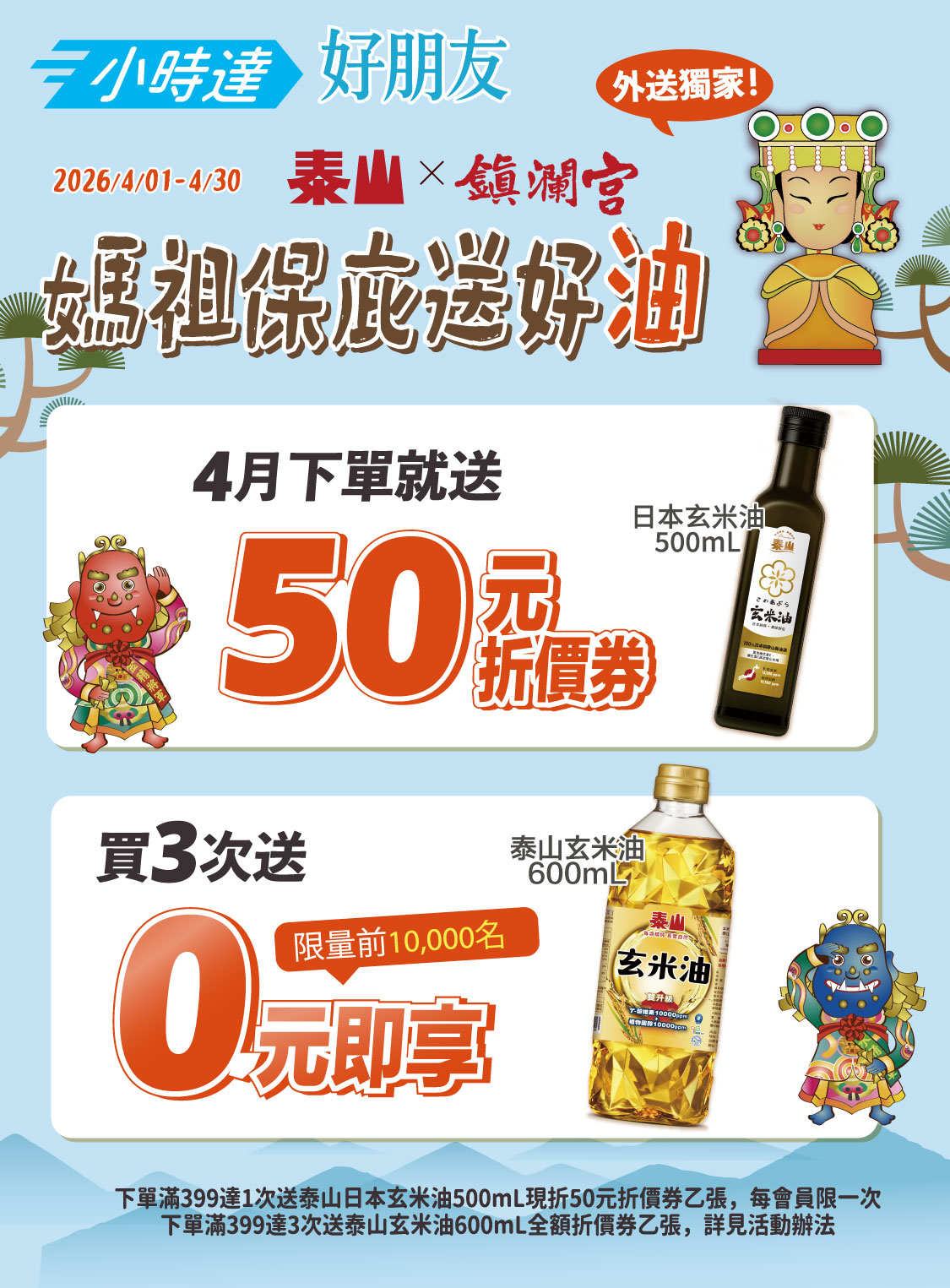 活動名稱:小時達媽祖保庇送好油4月下單399滿3次送泰山玄米油
