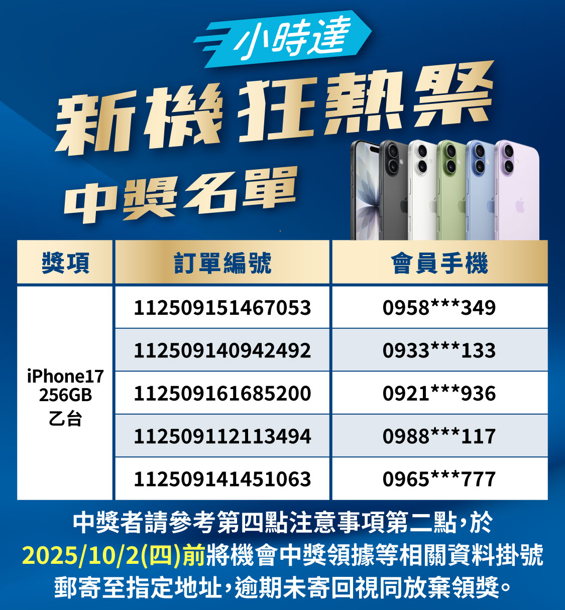 n 中獎者需自行於2025/10/2 23:59前(郵戳為憑)依活動頁中獎名單相關說明,下載並完整填寫機會中獎所得領據、檢附相關資料(如:身分證正反面影本、機會中獎領據...等),掛號郵寄(郵資自付)至「10466台北市中山區敬業四路33號4樓 全聯小時達營運部「新機狂熱祭 抽iPhone 17」活動小組(連絡電話:02-2532-8000)」。逾期未寄回、遺失、資料異常或不完整、不符本公司相關活動規範、其他異常等,視為自動放棄領獎權利,恕無法要求補發、不另行通知、亦不補抽。獎項將於2025/10/17統一陸續贈出。