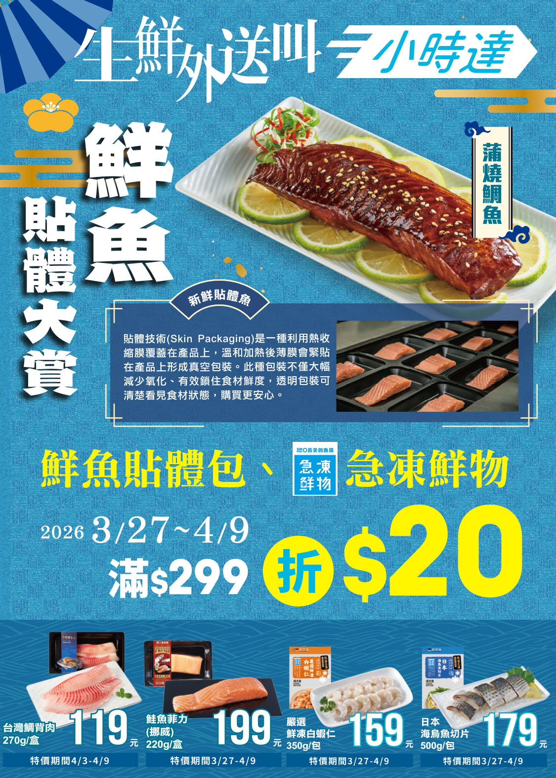 活動期間於小時達下單,指定生鮮急凍鮮物、鮮魚貼體包商品單筆滿299元折20。