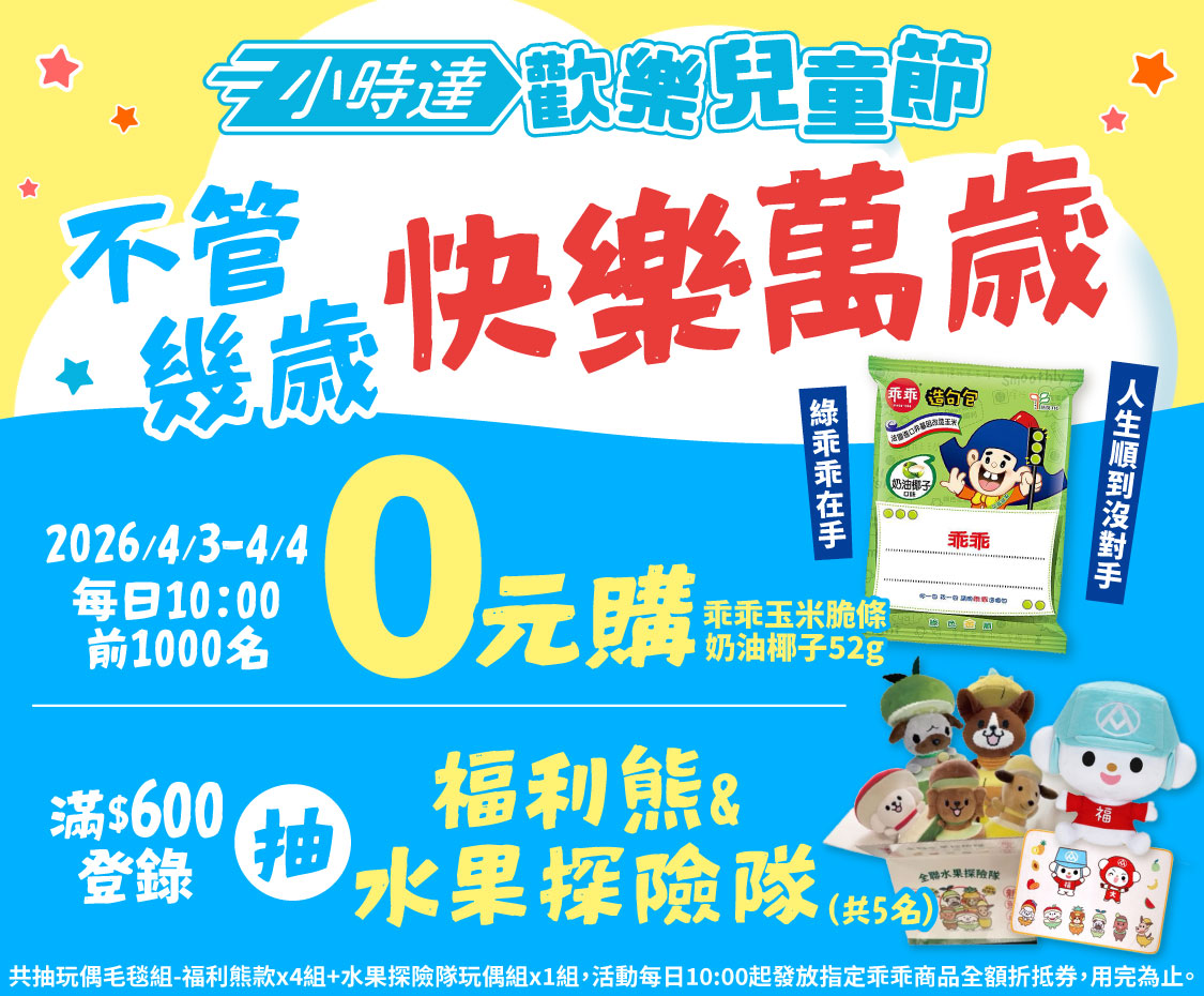 活動期間內,每日 10:00 起發放指定商品-乖乖玉米脆條 奶油椰子52g全額折抵折價券,每日限量1000張,依實際結帳順序用完為止。