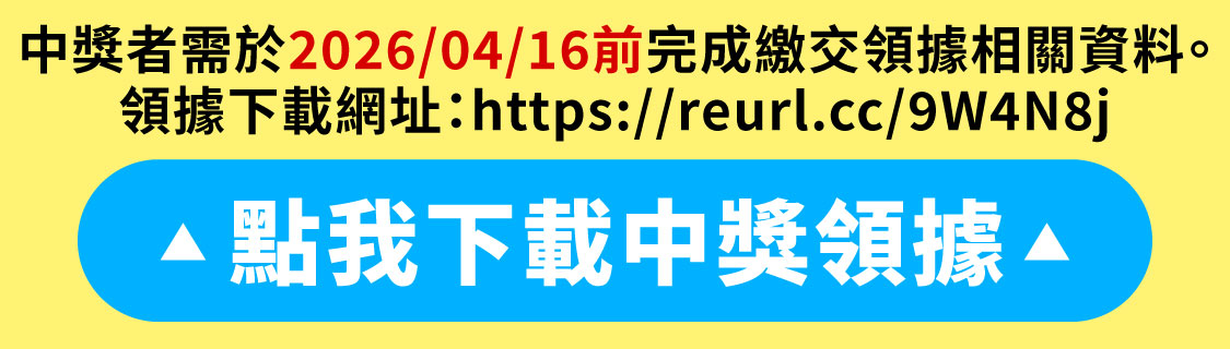 n 中獎者保證所有填寫或提供之資料均為真實正確,內容未冒用或盜用任何第三人之資料,如有不實或不正確之情事,將取消其中獎資格。如有致損害於主辦單位或其他任何第三人,中獎者應自負一切相關法律責任。若因填寫錯誤導致無法聯繫中獎者或獎項無法寄出,視同放棄中獎權利,恕主辦單位無法補給獎項(品)。