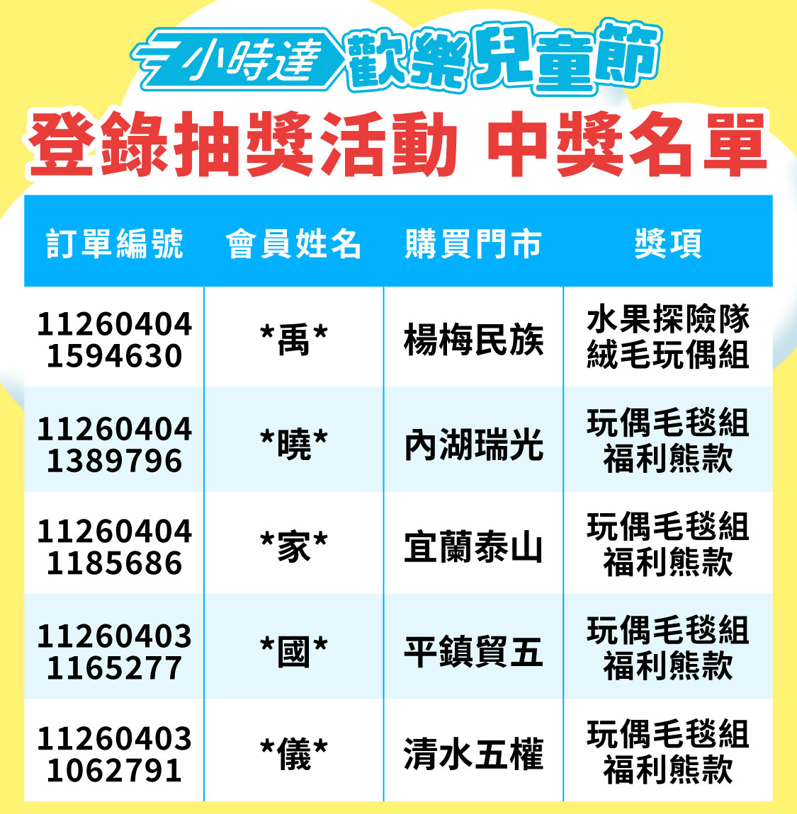 活動之中獎者名單將於2026/04/10(五)10:00前公告於「全聯小時達」活動頁,請自行查詢。中獎者需依本注意事項領取獎項,於指定時間內完成繳交相關資料後,由