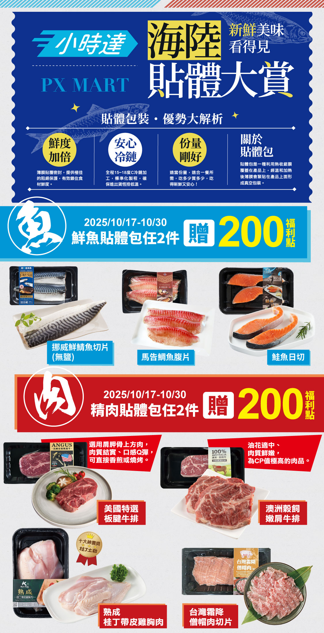 (2.)活動期間購買小時達指定精肉貼體包商品任2件贈200福利點,單筆可累贈,每會員上限400福利點。
