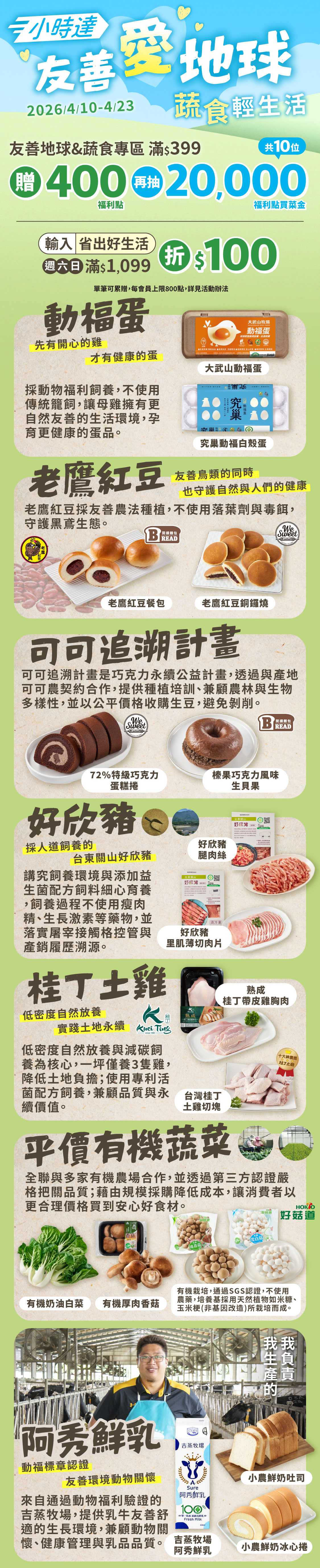 (活動1.)於指定活動日期購買小時達指定友善商品(活動頁標示)單筆滿$399贈400福利點,本活動點數回饋單筆可累贈,每會員帳號贈點上限800福利點。