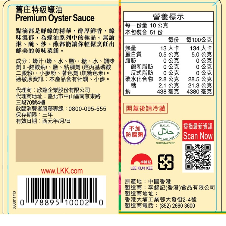 | 其他詳細說明 | 烹調時,加入少許蠔油可搭配醬油或其他調味料, 即可調製出鮮味菜餚 ; 醃製時, 加入少許蠔油,更可以去除冷凍食品的雪藏味,令食材倍添鮮味, 亦適合於醃製或烹調肉類、拌食蔬菜、炒海鮮、調味豆製品、麵食、飯 |