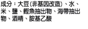 | 內容物(成分) | 大豆(非基因改造)、水、米、鹽、鰹魚抽出物、海帶抽出物、酒精、胺基乙酸 |