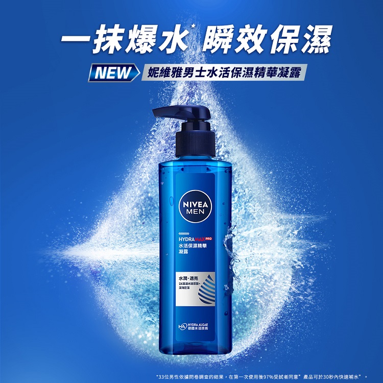 | 產品特色 | 妮維雅男士水活保濕系列採用德國水活技術,幫助肌膚快速補水,持續保濕。有效提升肌膚飽滿度、明亮度、油水平衡,並緊緻毛孔,輕鬆打造男人由內而外自信魅力。 |