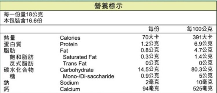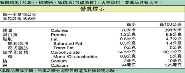 | 內容物(成分) | 有機糙米(台灣),碳酸鈣,有機卵磷脂(含磷脂質)(美國),天然香料,本產品含有大豆。 |