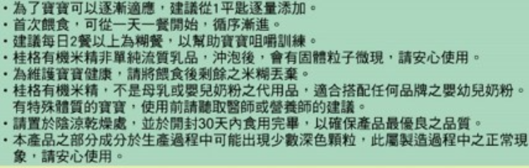 | 商品說明 | .為了寶寶可以逐漸適應,建議從1平匙量添加。 ·首次餵食,可從一天一餐開始,循序漸進。 .建議每日2餐以上為糊餐,以幫助咀嚼訓練。 桂格有機米精非單純流質乳品,沖泡後,會有固體子微現,請安心使用。 .為維護寶寶健康,請將餵食後剩餘之米糊丟棄。 桂格有機米精,不是母乳或嬰兒奶粉之代用品,適合搭配任何品牌之嬰幼兒奶粉。 |