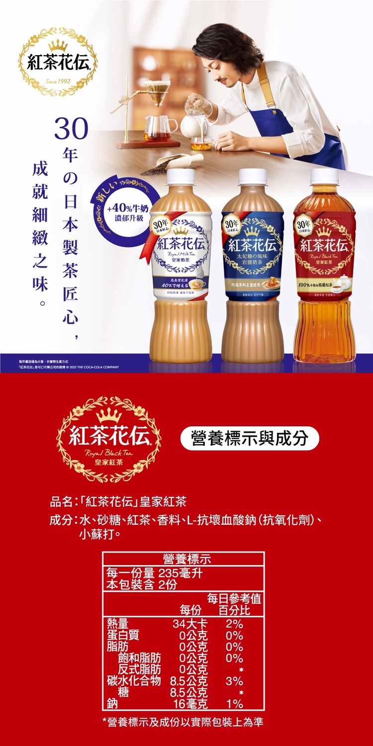 | 內容物(成分) | 水,砂糖,紅茶,香料,L-抗壞血酸鈉(抗氧化劑),小蘇打。 |