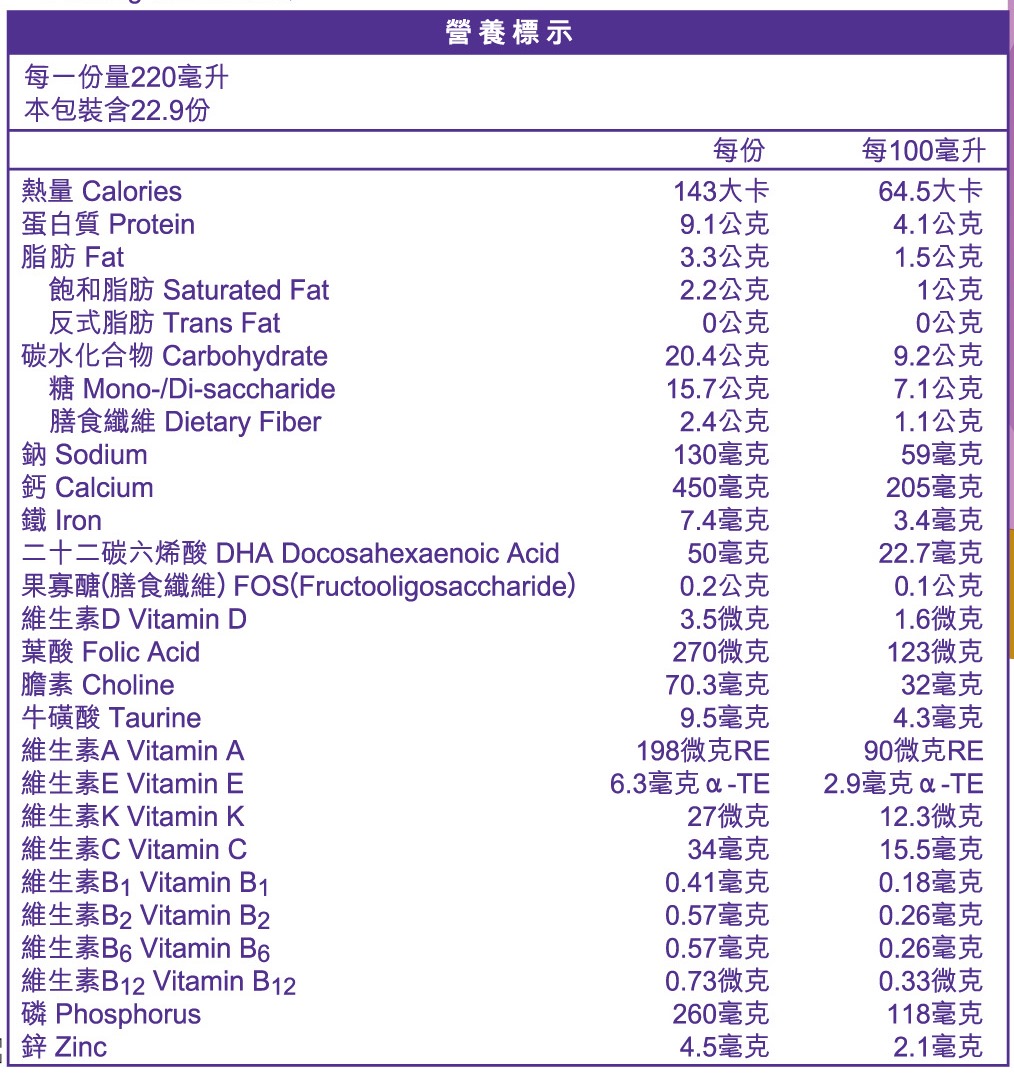| 內容物(成分) | 脫脂奶粉、全脂奶粉、膳食纖維[難消化性麥芽糊精、果寡醣、菊糖(菊苣纖維)]、麥芽糊精、深海魚油(含DHA)、碳酸鈣、重酒石酸膽生僉、磷酸鎂、香料、維生素(維生素E、維生素C、維生素A、維生素D3、維生素B6、維生素K1、維生素B1、葉酸、維生素B2)、焦磷酸鐵、葡萄糖酸鋅、卵磷脂(含磷脂質)、牛磺酸、肌醇、磷酸鈣、比菲德氏菌、嗜酸乳酸桿菌、副酪乳酸桿菌。 |
