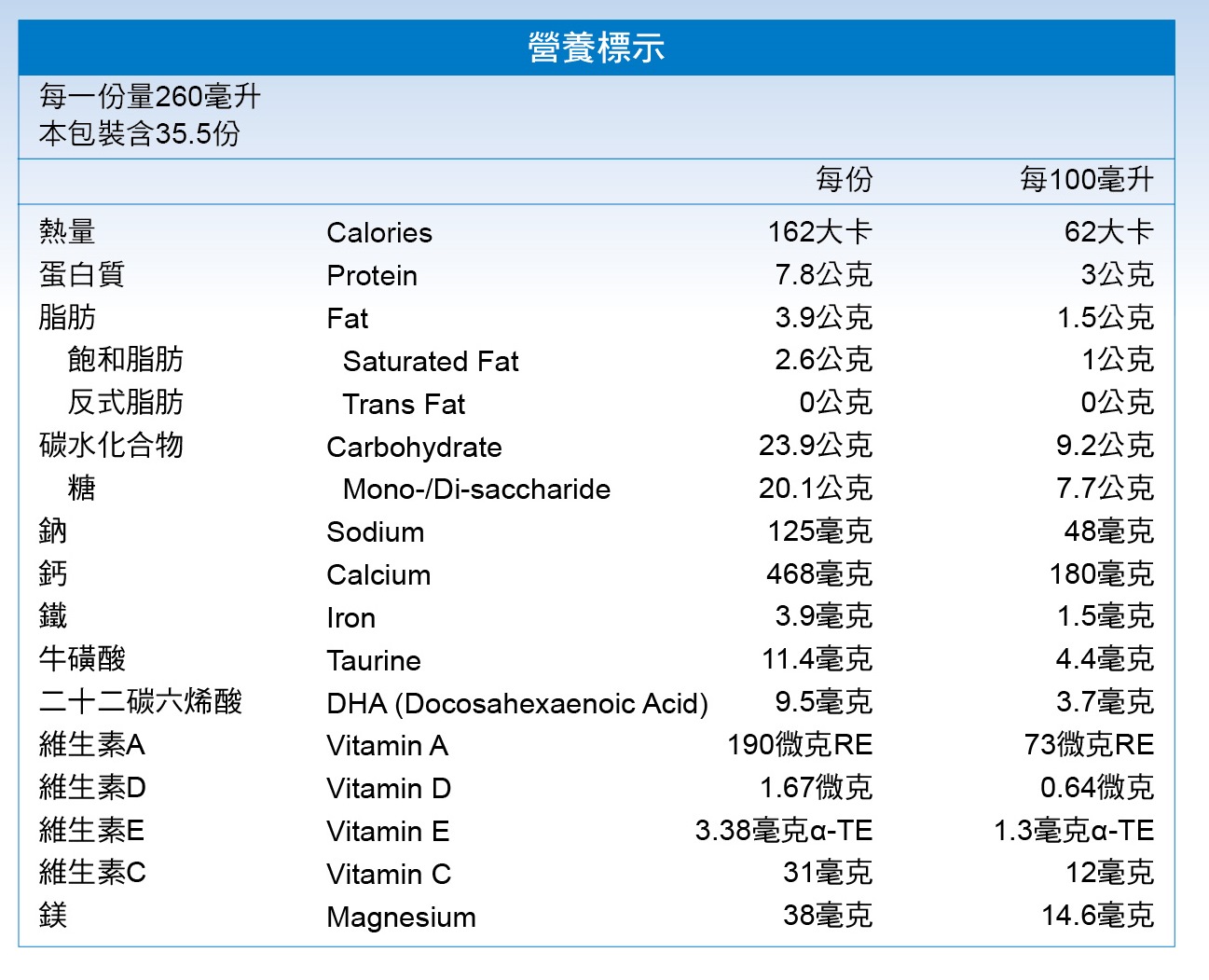 | 內容物(成分) | 奶粉 (脫脂奶粉、全脂羊奶粉、全脂奶粉)、麥芽糊精、蔗糖、碳酸鈣、深海魚油、重酒石酸膽生僉、香草香料、磷酸鎂、維生素(維生素C、維生素E、維生素A、維生素D3、維生素K1、維生素B1、維生素B6、葉酸、維生素B2)、焦磷酸鐵、牛磺酸、葡萄糖酸鋅。 |