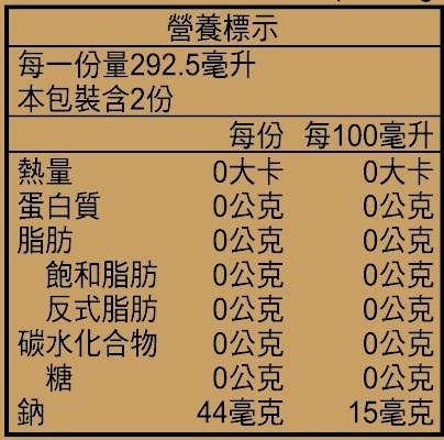| 內容物(成分) | 水,茶葉,人工香料,維生素C(抗氧化劑),碳酸氫鈉 |