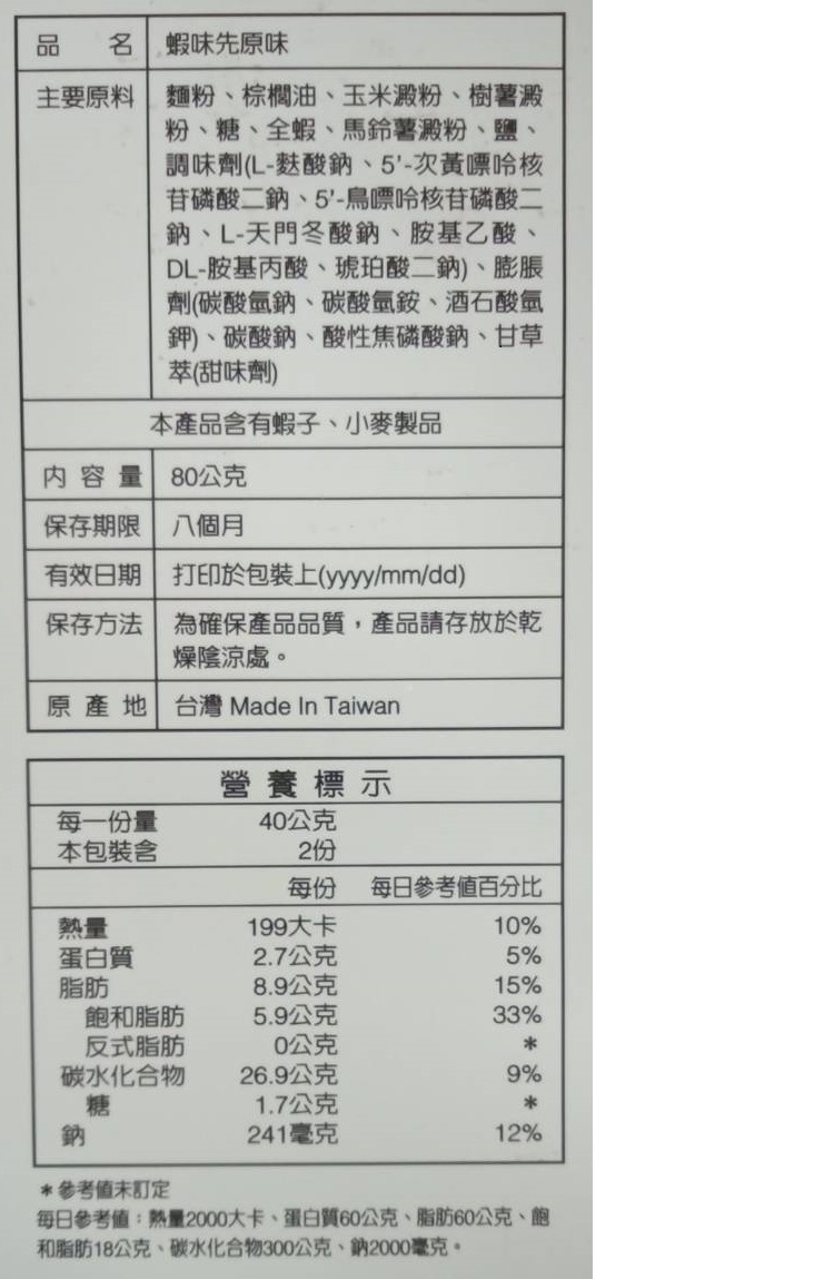 | 內容物(成分) | 主要原料:麵粉、棕櫚油、玉米澱粉、樹薯澱粉、糖、全蝦、馬鈴薯澱粉、鹽、調味劑(L-麩酸鈉、5’-次黃嘌呤核苷磷酸二鈉、5’-鳥嘌呤核苷磷酸二鈉、L-天門冬酸鈉、胺基乙酸、DL-胺基丙酸、琥珀酸二鈉)、膨脹劑(碳酸氫鈉、碳酸氫銨、酒石酸氫鉀)、碳酸鈉、酸性焦磷酸鈉、甘草萃(甜味劑) |