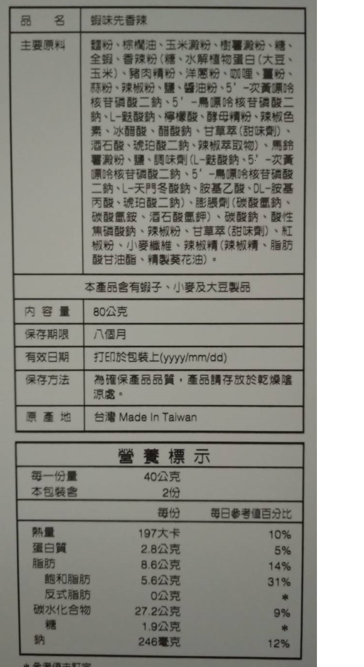 | 內容物(成分) | 主要原料:麵粉、棕櫚油、玉米澱粉、樹薯澱粉、糖、全蝦、香辣粉(糖、水解植物蛋白(大豆、玉米)、豬肉精粉、洋蔥粉、咖哩、薑粉、蒜粉、辣椒粉、鹽、醬油粉、5’-次黃嘌呤核苷磷酸二鈉、5’-鳥嘌呤核苷磷酸二鈉、L-麩酸鈉、檸檬酸、酵母精粉、辣椒色素、冰醋酸、醋酸鈉、甘草萃(甜味劑)、酒石酸、琥珀酸二鈉、辣椒萃取物) 、馬鈴薯澱粉、鹽、調味劑(L-麩酸鈉、5’-次黃嘌呤核苷磷酸二鈉、5’-鳥嘌呤核苷磷酸二鈉、L-天門冬酸鈉、胺基乙酸、DL-胺基丙酸、琥珀酸二鈉)、膨脹劑(碳酸氫鈉、碳酸氫銨、酒石酸氫鉀)、碳酸鈉、酸性焦磷酸鈉、辣椒粉、甘草萃(甜味劑)、紅椒粉、小麥纖維、辣椒精(辣椒精、脂肪酸甘油酯、精製葵花油)。 (本產品含有蝦子、小麥及大豆製品) |