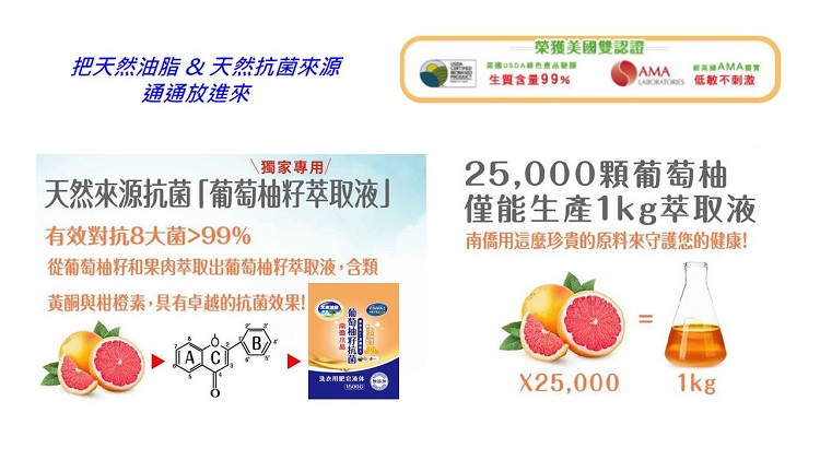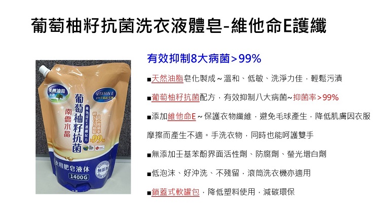 | 產品特色 | 葡萄柚籽天然成分, 抗八大菌高達99%, 天然油脂製造, 滾筒洗衣機亦適用(低泡沫/好沖洗/不殘留/添加維他命E, 保護衣物纖維, 呵護雙手 |