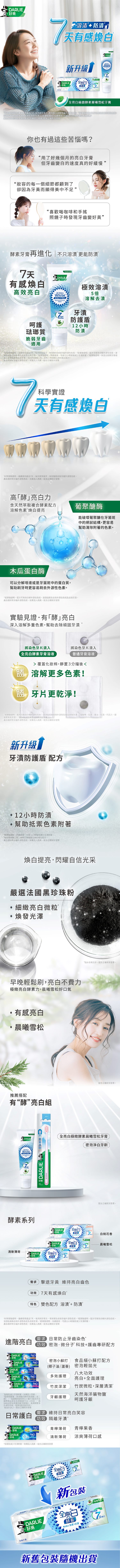| 商品說明 | 围 科學實證 7 天煥白 1 围 新升級雙色配方 溶漬 2 防漬 3 围 活酵配方溶漬科技 2 7 天煥白 1 微米級泡泡覆蓋口腔角落,全方位狙擊頑固色素。 5 倍極效去漬 4 ,牙齒 綻放無瑕鑽白光 围 12 小時防漬 3 ,「牙漬防護盾」配方 5 形成極效防護盾,根源防漬 3 全面護白,幫助抵禦色素附著,同時呵 護琺瑯質 , 脆弱牙齒適用 |