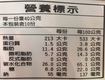 | 內容物(成分) | 麵粉、植物油(棕櫚油、大豆油)、蔗糖、麥芽糊精、可可粉、玉米澱粉、黃豆粉、乳粉、膨脹劑(碳酸氫銨、碳酸氫鈉)、大豆卵磷脂、香料、食鹽 |
