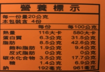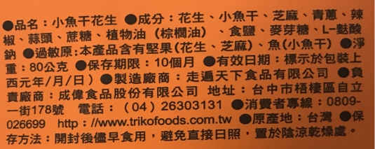 | 內容物(成分) | 花生、小魚干、芝麻、青蔥、辣椒、蒜頭、蔗糖、植物油(棕櫚油)、食鹽、麥芽糖、L-麩酸鈉 |
