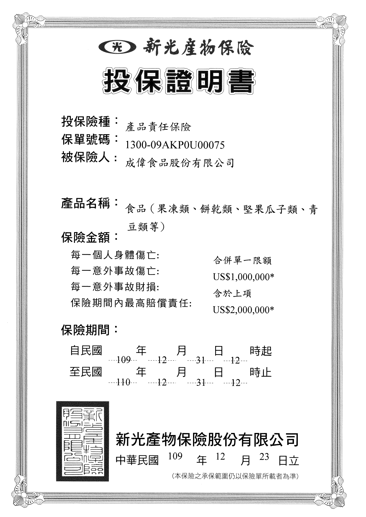 | 製造廠商 | 成偉食品股份有限公司 (04)2630-3131 台中市梧棲區自立一街178號 週一至週五08:00-17:00 |