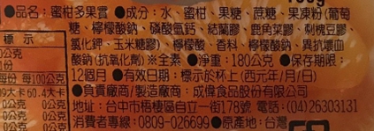 | 內容物(成分) | 水、蜜柑、果糖、蔗糖、果凍粉(葡萄糖、檸檬酸鈉、磷酸氫鈣、結蘭膠、鹿角菜膠、刺槐豆膠、氯化鉀、玉米糖膠)、檸檬酸、香料、檸檬酸鈉、異抗壞血酸鈉(抗氧化劑) |