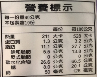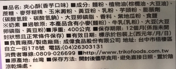 | 內容物(成分) | 麵粉、植物油(棕櫚油、大豆油)、蔗糖、麥芽糊精、玉米澱粉、黃豆粉、乳粉、芋頭粉、膨脹劑(碳酸氫銨、碳酸氫鈉)、大豆卵磷脂、香料、紫地瓜粉、食鹽。 |