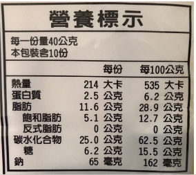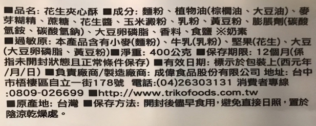 | 內容物(成分) | 麵粉、植物油(棕櫚油、大豆油)、麥芽糊精、蔗糖、花生醬、玉米澱粉、乳粉、黃豆粉、膨脹劑(碳酸氫銨、碳酸氫鈉)、大豆卵磷脂、香料、食鹽。 |