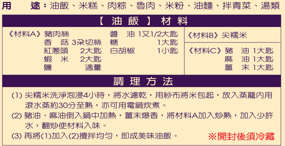 | 內容物(成分) | 紅蔥頭、大豆油 |
