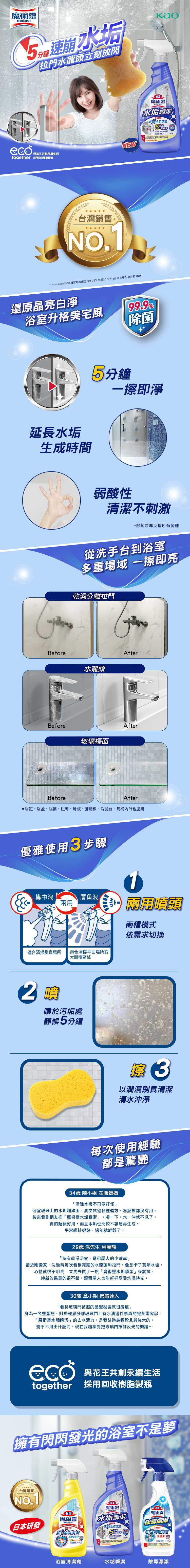| 產品特色 | ●日本研發 速解水垢泡泡: 只要5分鐘一擦即淨!瓦解水垢毫不費力。輕鬆去除玻璃拉門、水龍頭、蓮蓬頭、洗臉檯周邊堆積的水垢。延長水垢再次生成的時間,維持浴室的透明晶亮! ●弱酸性不易刺激: 讓清潔更安全,避免肌膚受到刺激傷害。 ●99.9%除菌: 清潔同時有效除菌。 ●兩用速泡噴頭: 使用便利,打掃不費力。 集中泡: 適合清掃垂直場所 廣角泡: 適合清掃平面場所或大面積區域 ●清新花香: 使用時不刺鼻,散發清新花香。 |