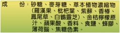| 內容物(成分) | 砂糖、麥芽糖、蜂膠、金桔檸檬原汁、草本植物濃縮物(薄荷、夏姑草、香椿、枇杷葉、仙草甘、羅漢果)、食鹽、蘋果酸、香料、薄荷腦、焦糖色素。 |