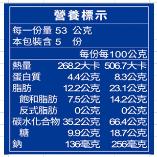 | 食品添加物名稱 | 膨脹劑(碳酸氫鈉、碳酸氫銨)、香料、泡打粉(玉米澱粉、酸性焦磷酸鈉、碳酸氫鈉)、偏亞硫酸氫鈉 |