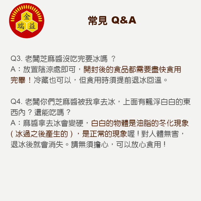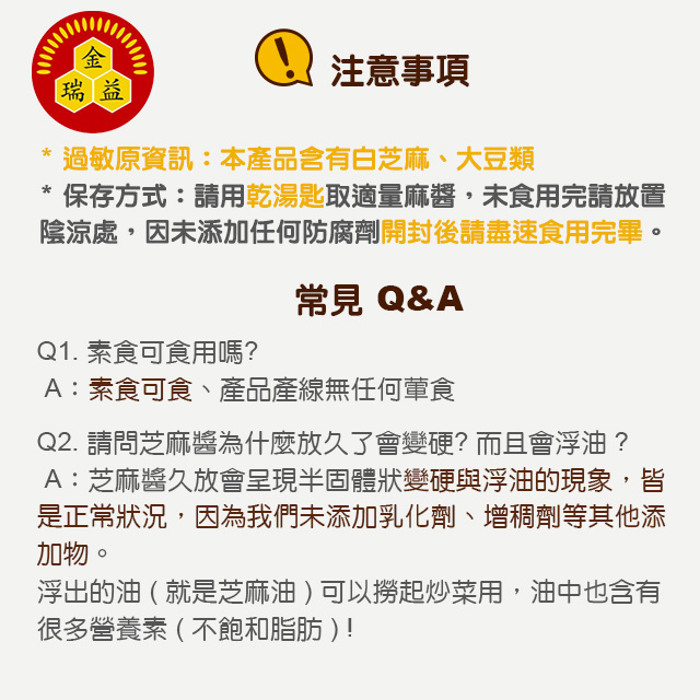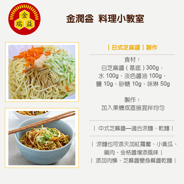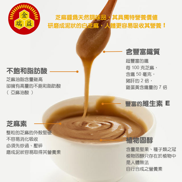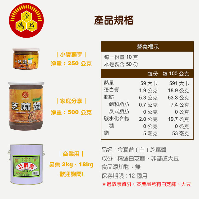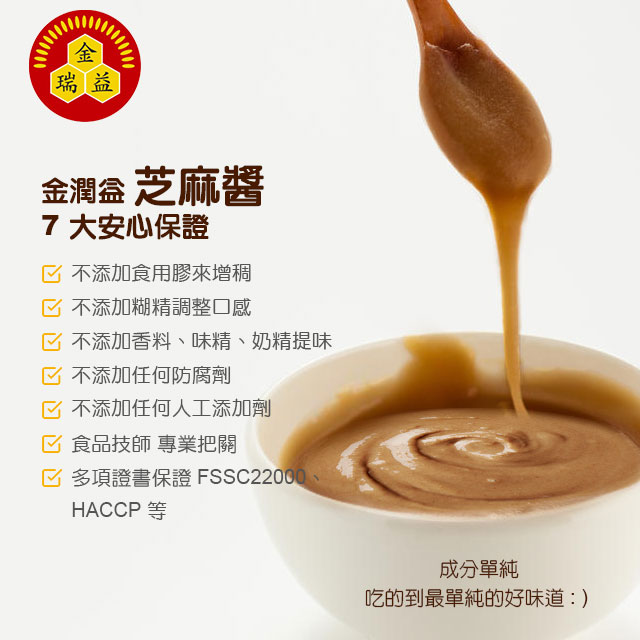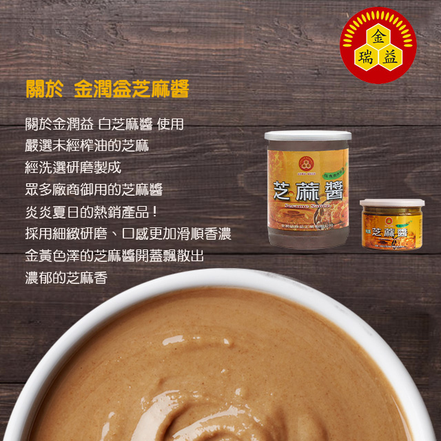 | 產品特色 | 關於金潤益 白芝麻醬,使用嚴選未經榨油的芝麻,經洗選研磨製成,眾多廠商御用的芝麻醬,炎炎夏日的熱銷產品! 採用細緻研磨、口感更加滑順香濃,金黃色澤的芝麻醬開蓋飄散出濃郁的芝麻香。 |