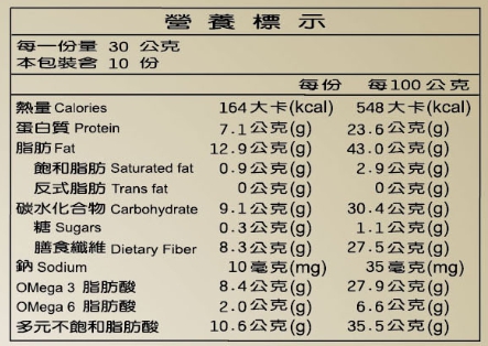 | 產品特色 | 採用細緻研磨 使人體更加容易吸收亞麻仁籽的營養成分 《亞麻仁籽粉》,每100公克含OMaga3 28g、OMaga6 7g、多元不飽和脂肪酸36g、 膳食纖維28g,高多元不飽和脂肪酸、高膳食纖維、高鐵的天然食材。 |