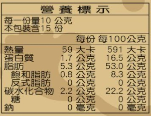 | 食用方式 | 開封即食方便食用,可直接拌入米飯、撒在麥片或優格、各式穀類粉、烤肉、烘焙料理、打成堅果漿等 |