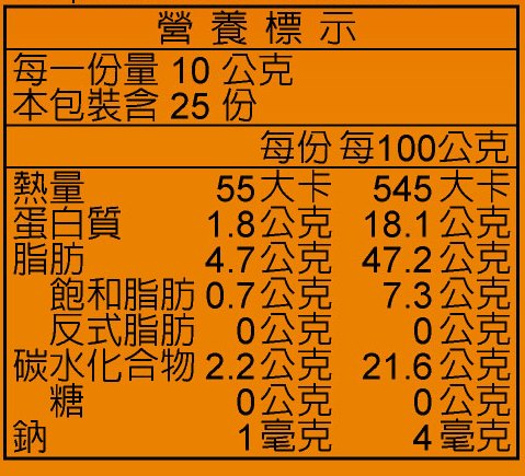 | 食用方式 | 佐食涼拌佳品 可直接食用或塗抹於麵包、饅頭、吐司 也可加入牛奶、豆漿、穀粉、精力湯中飲用 |