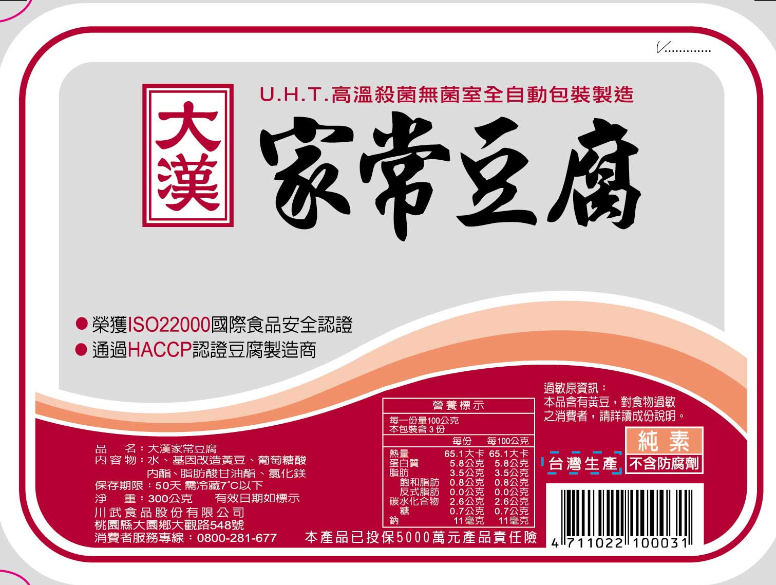 | 內容物(成分) | 水.基改黃豆.豆腐凝固劑(葡萄酸-ò內脂.氯化鎂)乳化劑(脂肪酸甘油脂) |