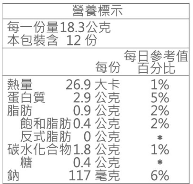 | 過敏源註記 | 本產品內含大豆、含麩質之穀物類、奶類、蛋類及其製品;本產品生產製程廠房,其設備或生產管線有處理魚類、堅果類、甲殼類、芝麻、種子類、花生、頭足類、螺貝類、芹菜、芥末、亞硫酸鹽類及其製品,不適合對其過敏體 |