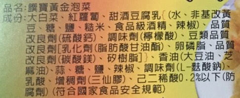 | 內容物(成分) | 大白菜,紅蘿蔔,甜酒豆腐乳,品質改良劑,調味劑,豆類品質改良劑,卵磷脂,香油,蒜,糖,鹽,辣椒,調味劑,乳酸,防腐劑0.2%以下(符合國家食品安全規範) |