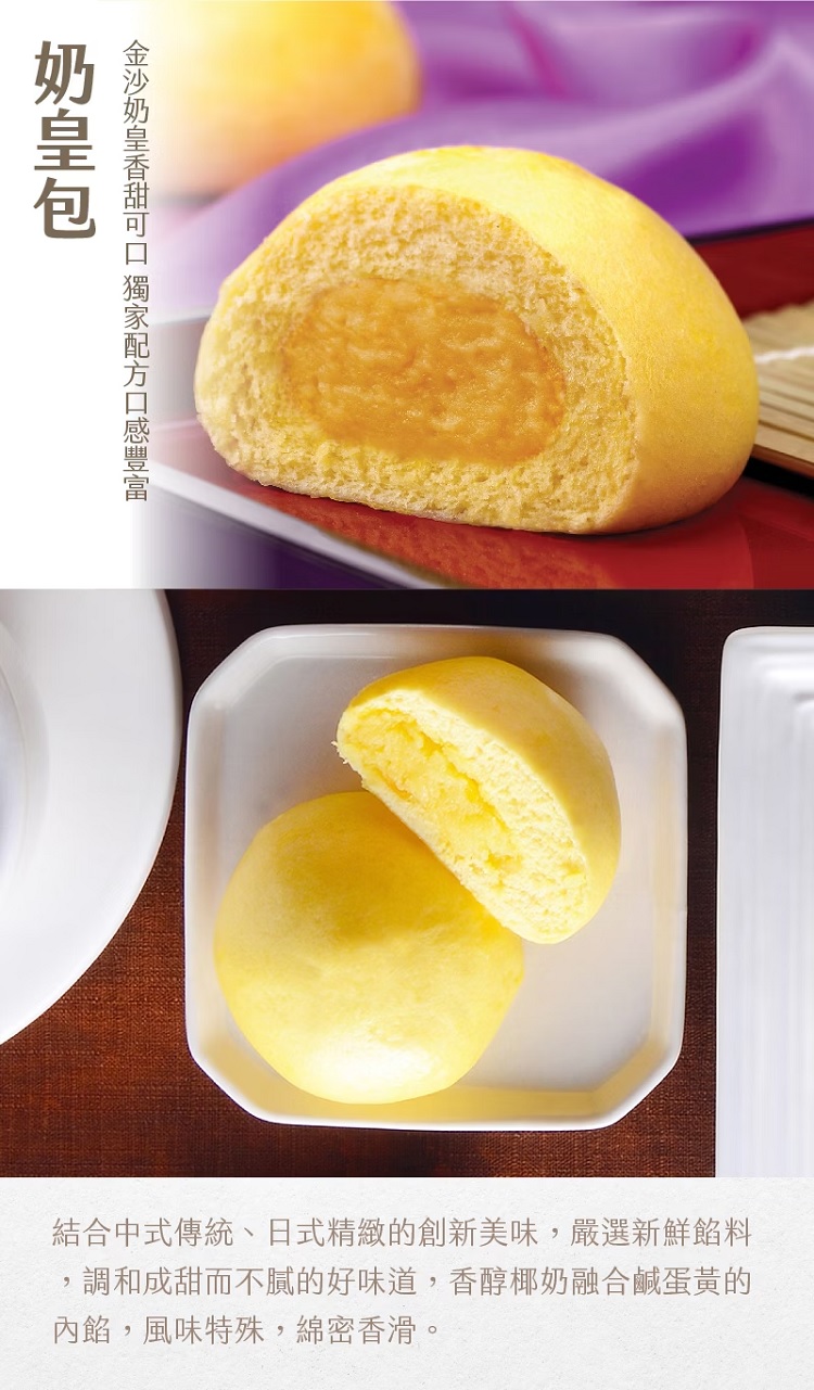 | 商品說明 | 結合中式傳統、西式精緻的創新美味,嚴選新鮮餡料,調和成甜而不膩的好味道。香醇椰奶融合鹹蛋黃的內餡,風味特殊,綿密香滑。 |