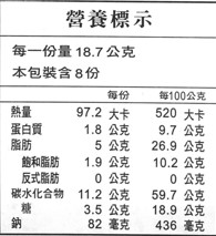 | 內容物(成分) | 麵粉、糖、花生醬(花生、花生油、糖、鹽)、棕櫚油、麥芽糊精、乳清粉、樹薯澱粉、碳酸鈣、乳糖、膨脹劑(碳酸氫鈉.碳酸氫銨)、酸性焦磷酸鈉、鹽、奶粉、脫水西洋芹、大豆卵磷脂、乳脂、香料 |
