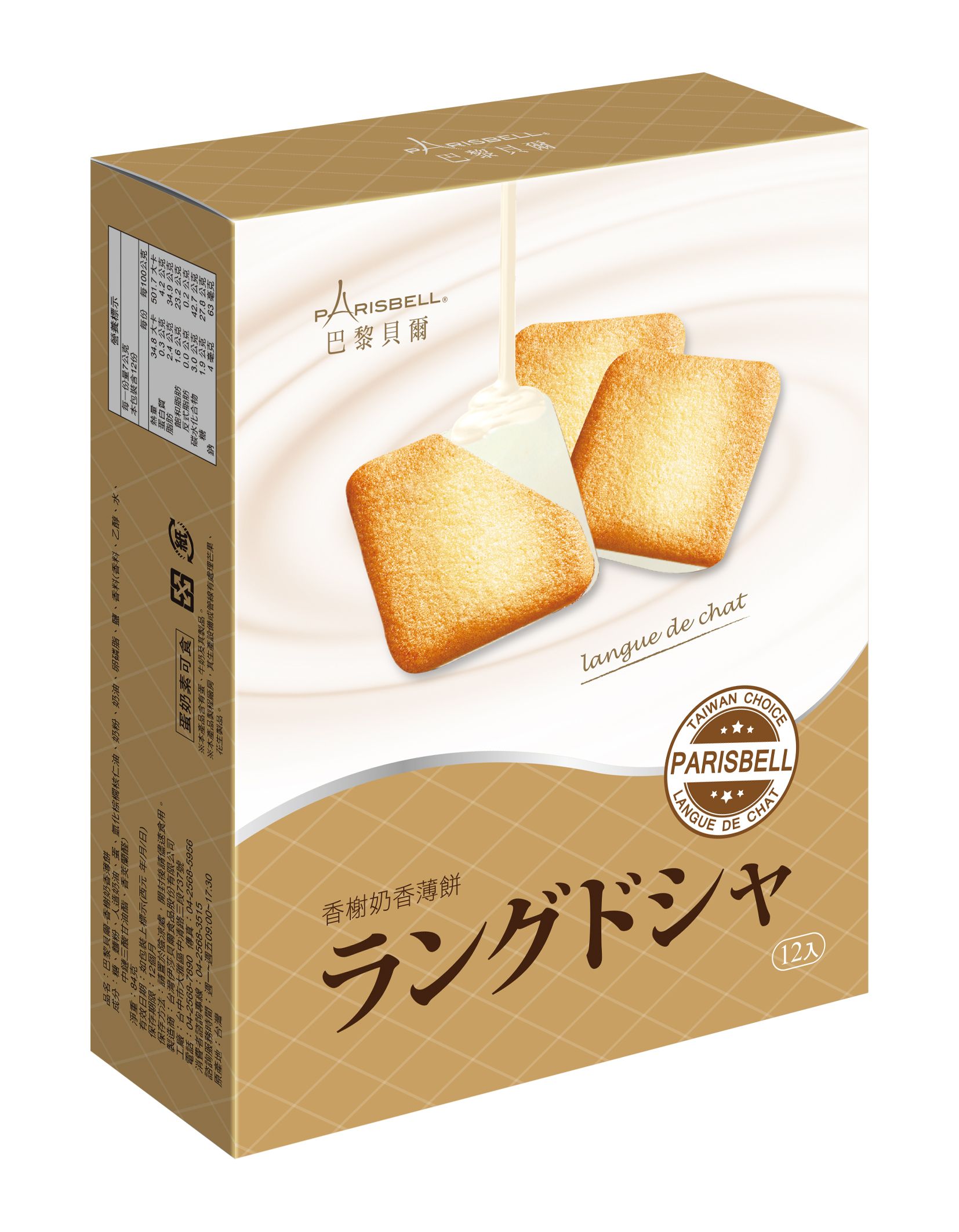 | 食品添加物名稱 | 麵粉、代可可脂白巧克力【添加完全氫化棕櫚核仁油】、蔗糖、人造奶油、蛋白、奶油、複方香料【含中鏈三酸甘油酯、水、乙醇、糖、甘油】、碘鹽 |