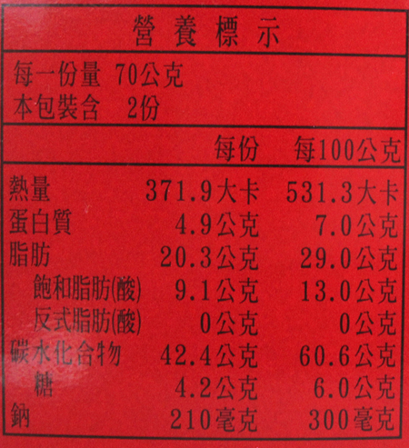 | 內容物(成分) | 麵粉、食用軟質棕油、食用烤酥油、糖粉(蔗糖、玉米澱粉)、麥芽抽出精、膨脹劑(碳酸氫銨、碳酸氫鈉、碳酸鎂)、食鹽、乾酵母粉、葡萄糖、奶粉、玉米澱粉、味精(L-麩酸鈉)、蛋白分解酵素P-18(小麥粉、蛋白分解酵素)、偏亞硫酸氫鈉。 |