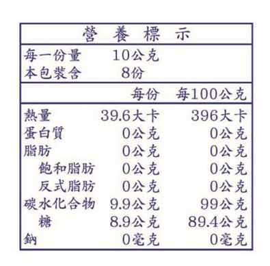 | 內容物(成分) | 砂糖、玉蜀黍糖漿 |