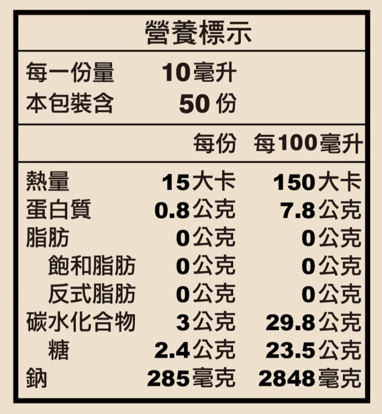 | 內容物(成分) | 水、非基因改造黃豆、黑豆、澳洲海鹽、粗糖、米、紅麴米 |