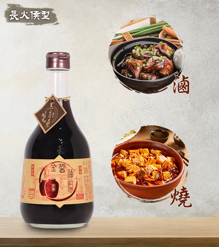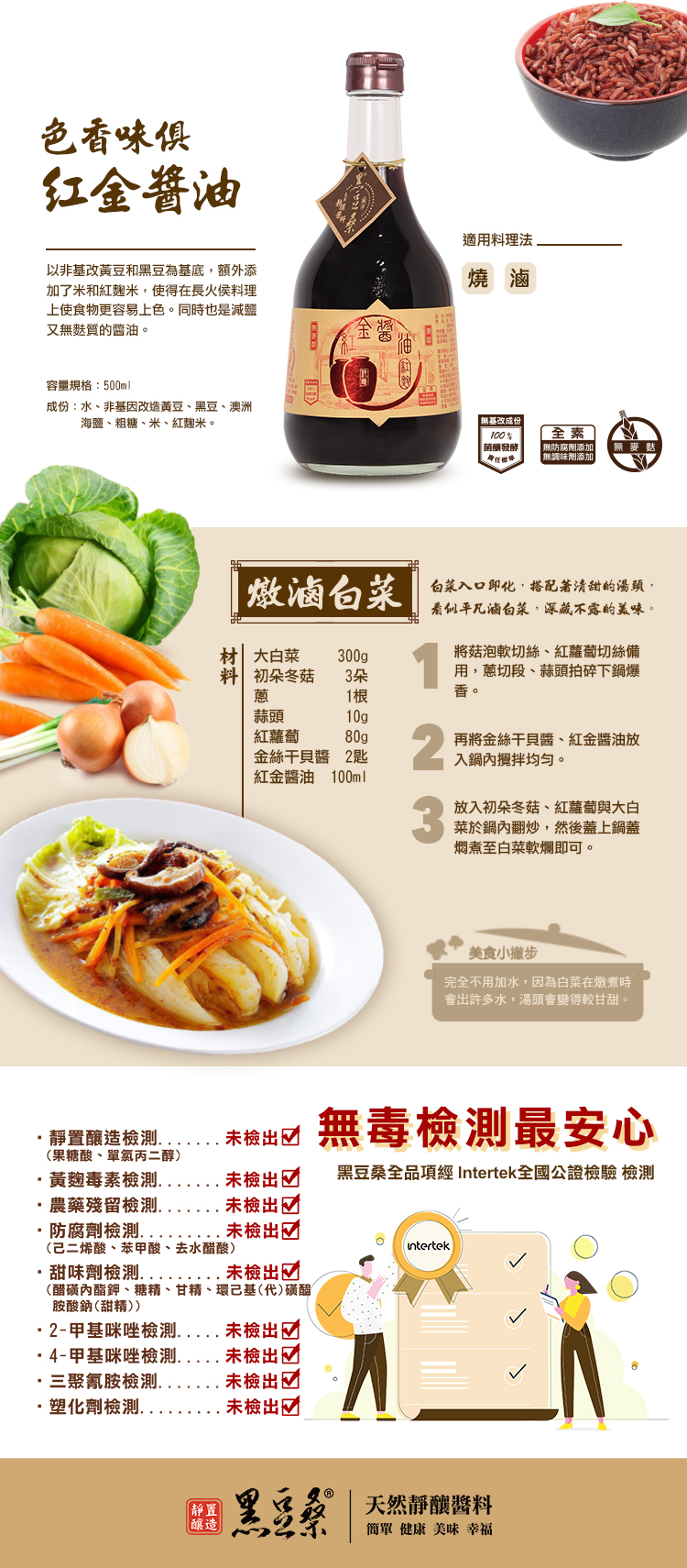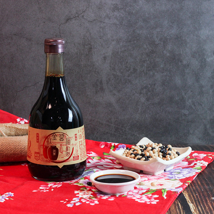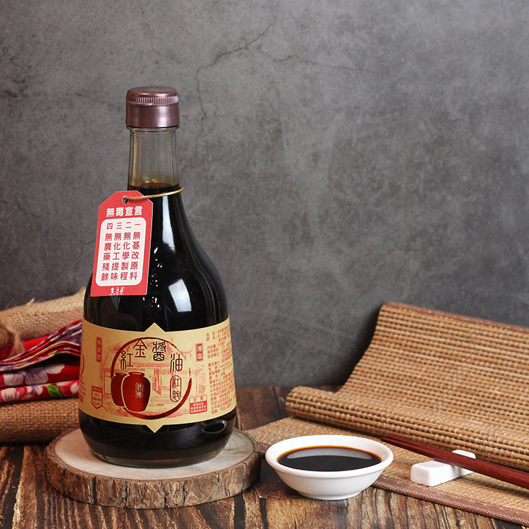 | 產品特色 | 減鹽又無麥麩的紅金醬油,適合口味較清淡的人,推薦適合紅燒滷!未使用防腐劑、無基改原料、無化學製程、無農藥殘餘、無色素甜味劑,為純釀造醬油。 |