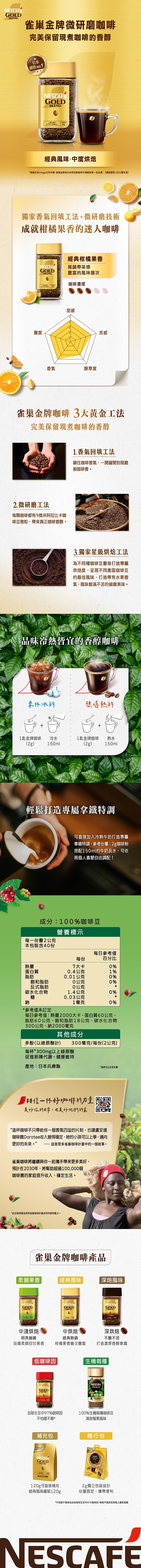 | 產品特色 | ● 嚴選柑橘果香阿拉比卡咖啡豆,搭配獨家烘焙技術,研磨製成100%純正即溶黑咖啡。 ● 雀巢金牌為日本即溶黑咖啡市場銷售第一名的品牌。 ● 微研磨技術讓咖啡保有如頂級研磨咖啡般醇香 |