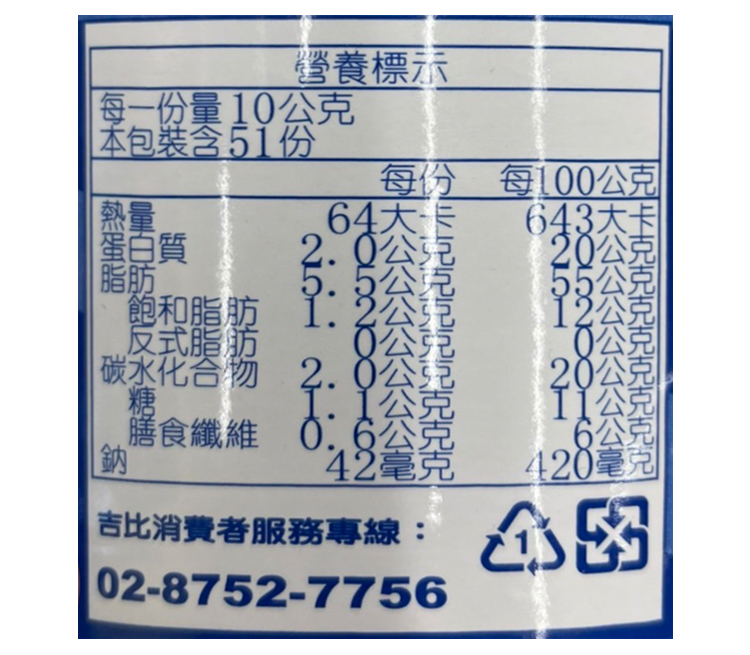 | 內容物(成分) | 花生、糖、花生油、完全氫化植物油(油菜籽油、精煉棉籽油、大豆油)、食用鹽 |