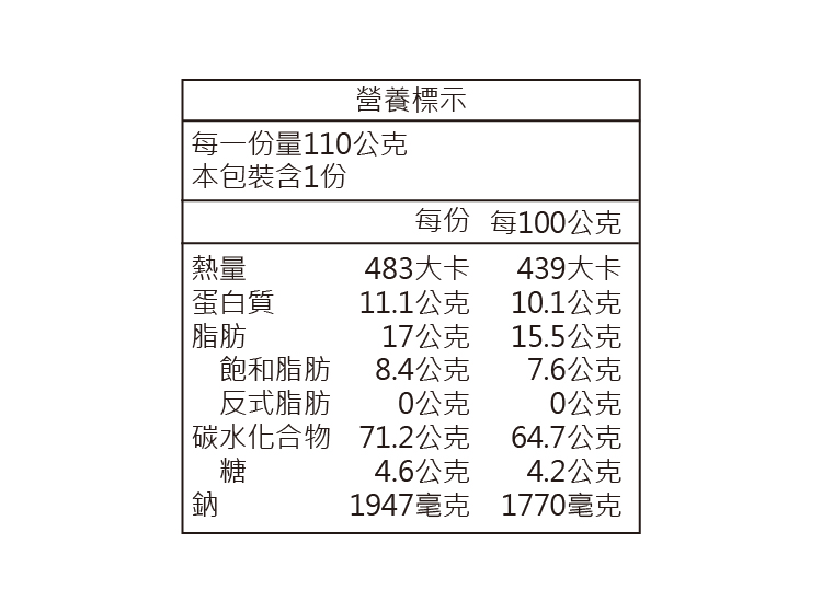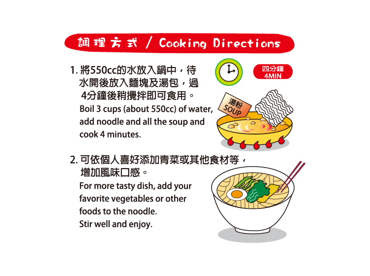 | 內容物(成分) | 麵條:小麥粉、棕櫚油、樹薯澱粉、醋酸澱粉、鹽、碳酸鈉、玉米糖膠、碳酸鉀、著色劑(核黃素)。 調味包:鹽、葡萄糖、味精(L-麩酸鈉)、調味粉[味精(L-麩酸鈉)、酵母粉、糖]、醬油粉[醬油(水、鹽、大豆、小麥)、麥芽糊精、糖、鹽]、5’-次黃嘌呤核苷磷酸二鈉、5’-鳥嘌呤核苷磷酸二鈉、檸檬酸、檸檬酸鈉、辣椒粉、二氧化矽、棕櫚油。 調味油:棕櫚油、莞荽油、婀娜多色素、抗氧化劑(維生素E)。 乾燥蔬菜包:乾燥香菜、乾燥高麗菜、乾燥香菇、乾燥紅蘿蔔。 |