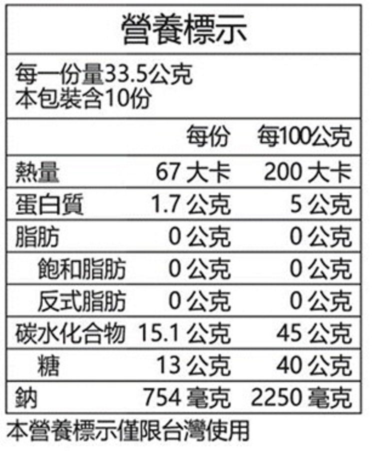 | 食品添加物名稱 | 混合醬油[醬油(水解大豆蛋白來源),醬油原液(大豆,小麥),鹽,果糖,酒精],砂糖,玉米糖漿,水,酒精,大蒜粉,洋蔥粉,醋酸澱粉,薑,芝麻油(炒芝麻粉,大豆油),芝麻,濃縮釀造醋(水,糯米),檸檬酸,焦糖色素,黑胡椒粉,水梨濃縮液,鳳梨濃縮液,玉米糖膠,己二烯酸鉀(防腐劑) |
